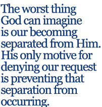 The reason why prayer doesn’t work for most of us is, simply, that we don’t know what we’re doing. We receive precious little instruction about prayer, about what it is and what it’s not, about our responsibility in the process, about how to apply this resource. We miss the point that we are, in fact, praying wrong; that we are in a wrong place with God and we are asking God for the wrong things—and asking them arrogantly, at that. Then, when God doesn’t jump through hoops we’ve eloquently laid out, we begin to doubt His power and even His existence, not realizing that God always answers prayer. It’s just that His answer, His acts, are in the divine realm and operate far beyond human understanding. Trusting in this process is called “faith,” a choice to operate in a realm beyond what we can see and touch and understand. But to trust in a certain knowledge that God loves us and knows what is ultimately best for us.